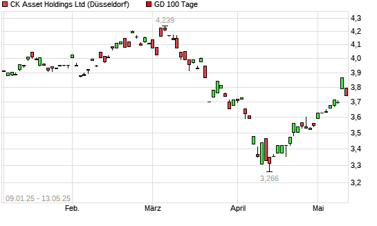 Mit dem Anstieg auf 3,83 EUR hat die CK Asset Holdings-Aktie am 12.05.2025 die 100-Tage-Linie nach oben gekreuzt.