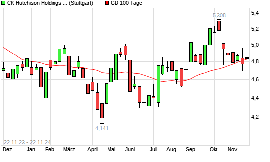 Mit dem Anstieg auf 4,88 EUR hat die CK Hutchison Holdings-Aktie am 21.11.2024 die 100-Tage-Linie nach oben gekreuzt.