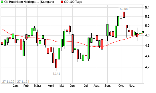 Mit dem Anstieg auf 4,90 EUR hat die CK Hutchison Holdings-Aktie am 26.11.2024 die 100-Tage-Linie nach oben gekreuzt.