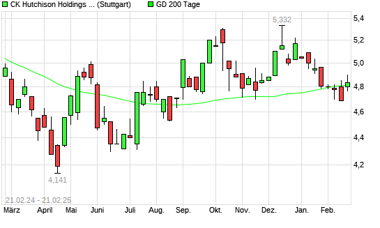 Mit dem Anstieg auf 4,91 EUR hat die CK Hutchison Holdings-Aktie am 20.02.2025 die 200-Tage-Linie nach oben gekreuzt.