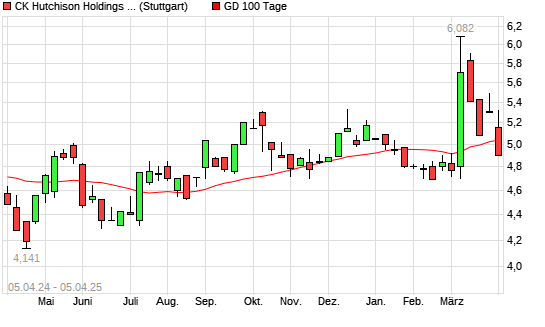 Mit dem Rücksetzer auf 5,08 EUR hat die CK Hutchison Holdings-Aktie am 04.04.2025 die 100-Tage-Linie nach unten gekreuzt.