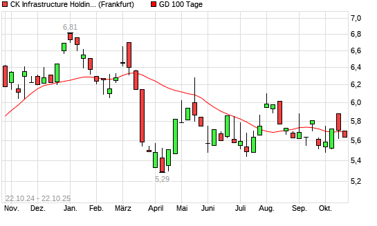 Mit dem Rücksetzer auf 5,65 EUR hat die CK Infrastructure Holdings-Aktie am 21.10.2025 die 100-Tage-Linie nach unten gekreuzt.