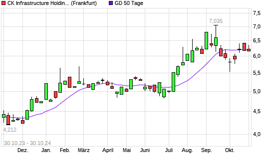 Mit dem Rücksetzer auf 6,20 EUR hat die CK Infrastructure Holdings-Aktie am 29.10.2024 die 50-Tage-Linie nach unten gekreuzt.