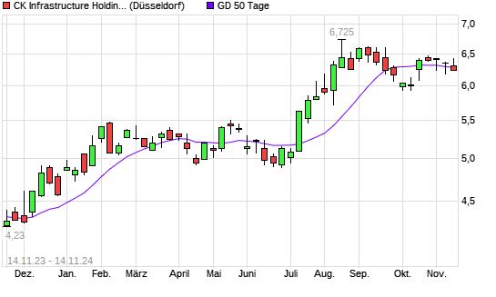 Mit dem Rücksetzer auf 6,14 EUR hat die CK Infrastructure Holdings-Aktie am 13.11.2024 die 50-Tage-Linie nach unten gekreuzt.