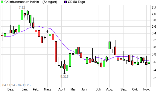 Mit dem Rücksetzer auf 5,55 EUR hat die CK Infrastructure Holdings-Aktie am 03.11.2025 die 50-Tage-Linie nach unten gekreuzt.