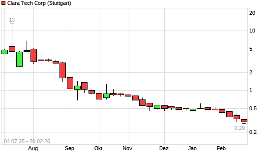 Mit dem Rücksetzer auf 0,30 EUR hat die CLARA TECH. O.N.-Aktie (ISIN CA17989L1022) am 19.02.2026 ein neues 12-Monats-Tief erreicht und damit den Kurs vom ...weiterlesen