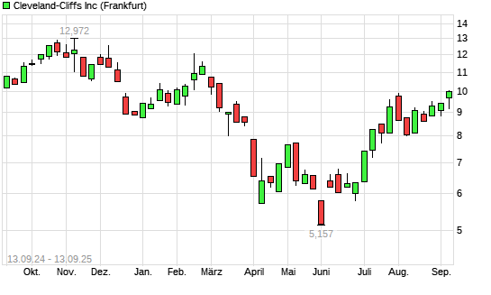 Mit dem Anstieg auf 10,00 EUR hat die CLEVELAND-CLIFFS-Aktie (ISIN US1858991011) am 12.09.2025 ein neues 6-Monats-Hoch erreicht und damit den Kurs vom 28.07.2025 eingestellt.