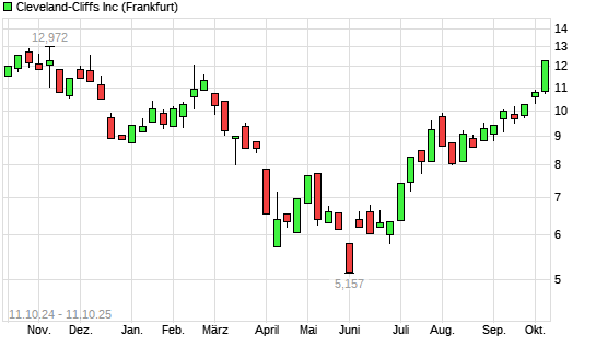 Mit dem Anstieg auf 12,27 EUR hat die CLEVELAND-CLIFFS-Aktie (ISIN US1858991011) am 10.10.2025 ein neues 6-Monats-Hoch erreicht und damit den Kurs vom 09.10.2025 eingestellt.