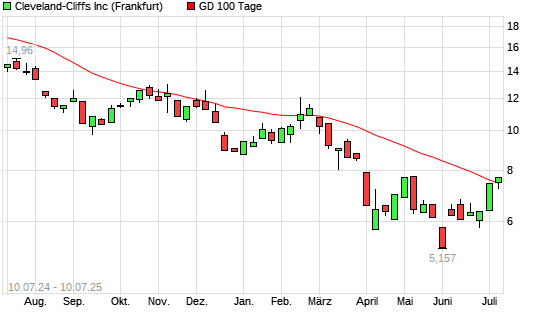 Mit dem Anstieg auf 7,52 EUR hat die CLEVELAND-CLIFFS-Aktie am 09.07.2025 die 100-Tage-Linie nach oben gekreuzt.