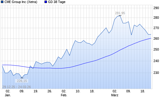 Mit dem Rücksetzer auf 261,75 EUR hat die CME Group-Aktie am 23.03.2026 die 38-Tage-Linie nach unten gekreuzt.
