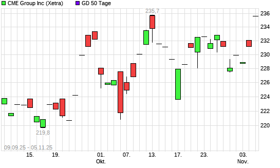 Mit dem Rücksetzer auf 225,60 EUR hat die CME Group-Aktie am 04.11.2025 die 50-Tage-Linie nach unten gekreuzt.
