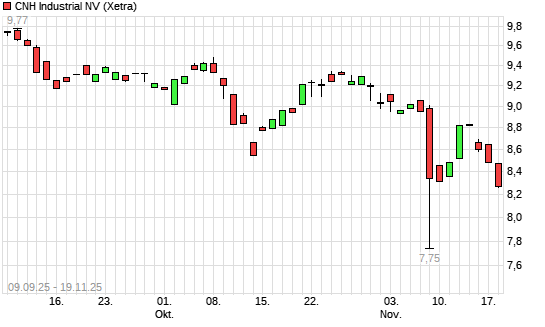 Mit dem Rücksetzer auf 8,22 EUR hat die CNH Industrial-Aktie (ISIN NL0010545661) am 18.11.2025 ein neues 3-Jahres-Tief erreicht und damit den Kurs vom 10.11.2025 eingestellt.
