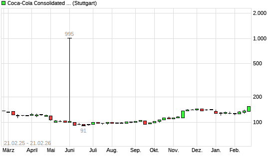 Mit dem Anstieg auf 152,00 EUR hat die COCA-COLA BOTTLING CO CONSOLID-Aktie (ISIN US1910981026) am 20.02.2026 ein neues All-Time-High erreicht und damit den Kurs vom 19.02.2026 eingestellt.