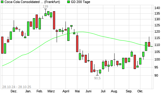 Mit dem Anstieg auf 109,00 EUR hat die COCA-COLA BOTTLING CO CONSOLID-Aktie am 27.10.2025 die 200-Tage-Linie nach oben gekreuzt.