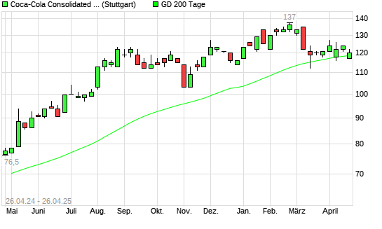 Mit dem Rücksetzer auf 1.190,00 EUR hat die COCA-COLA BOTTLING CO CONSOLID-Aktie am 25.04.2025 die 200-Tage-Linie nach unten gekreuzt.