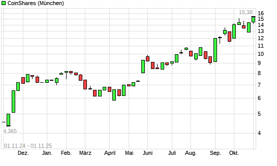 Mit dem Anstieg auf 15,08 EUR hat die COINSHARES I.-Aktie (ISIN JE00BLD8Y945) am 31.10.2025 ein neues All-Time-High erreicht und damit den Kurs vom 07.10.2025 eingestellt.
