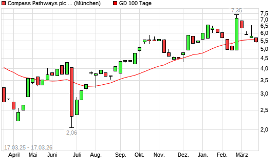 Mit dem Rücksetzer auf 5,40 EUR hat die COMPASS PATHW SP.ADR-Aktie am 16.03.2026 die 100-Tage-Linie nach unten gekreuzt.