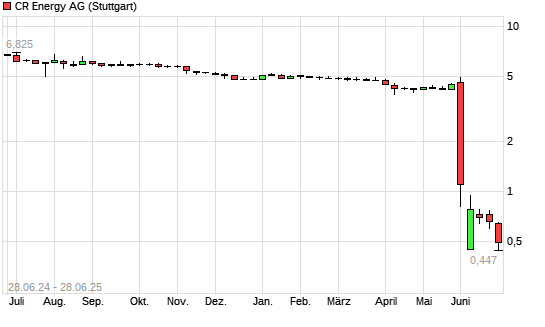 Mit dem Rücksetzer auf 0,50 EUR hat die CR Energy-Aktie (ISIN DE000A2GS625) am 27.06.2025 ein neues 10-Jahres-Tief erreicht und damit den Kurs vom 26.06.2025 eingestellt.