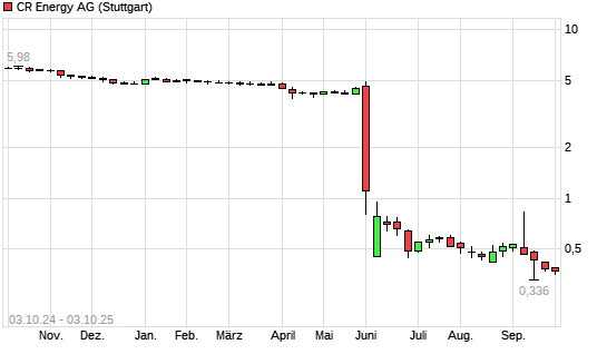Mit dem Rücksetzer auf 0,35 EUR hat die CR Energy-Aktie (ISIN DE000A2GS625) am 02.10.2025 ein neues All-Time-Low erreicht und damit den Kurs vom 25.09.2025 eingestellt.