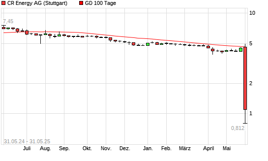 Mit dem Rücksetzer auf 1,05 EUR hat die CR Energy-Aktie am 30.05.2025 die 100-Tage-Linie nach unten gekreuzt.