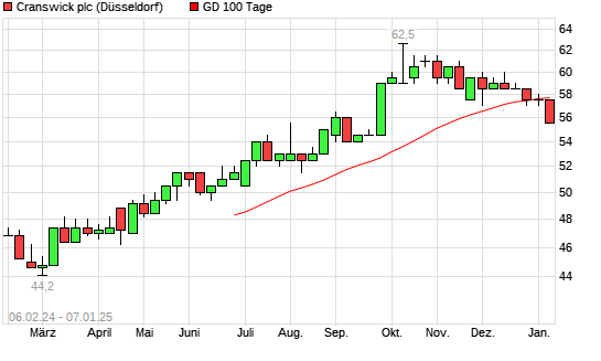 Mit dem Anstieg auf 59,50 EUR hat die CRANSWICK-Aktie am 06.01.2025 die 100-Tage-Linie nach oben gekreuzt.