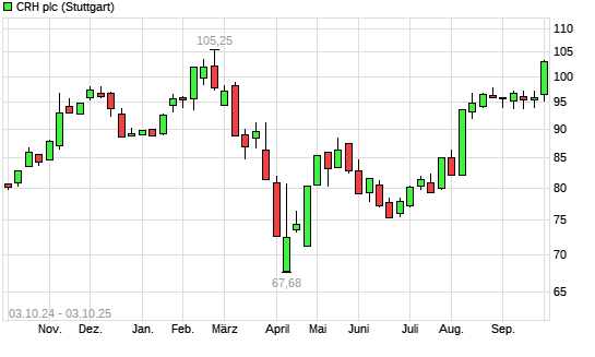 Mit dem Anstieg auf 102,20 EUR hat die CRH-Aktie (ISIN IE0001827041) am 02.10.2025 ein neues 6-Monats-Hoch erreicht und damit den Kurs vom 30.09.2025 eingestellt.