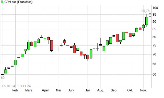 Mit dem Anstieg auf 95,78 EUR hat die CRH-Aktie (ISIN IE0001827041) am 12.11.2024 ein neues All-Time-High erreicht und damit den Kurs vom 11.11.2024 eingestellt.