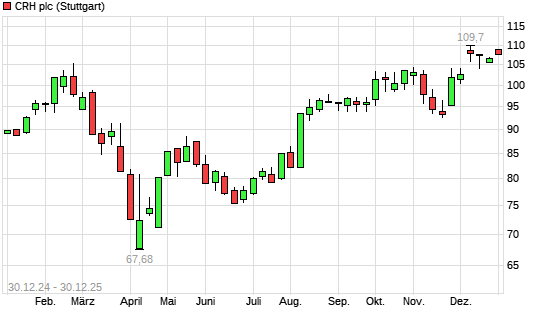 Mit dem Anstieg auf 109,80 EUR hat die CRH-Aktie (ISIN IE0001827041) am 29.12.2025 ein neues All-Time-High erreicht und damit den Kurs vom 16.12.2025 eingestellt.