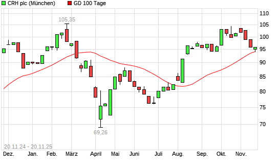Mit dem Rücksetzer auf 93,50 EUR hat die CRH-Aktie am 19.11.2025 die 100-Tage-Linie nach unten gekreuzt.