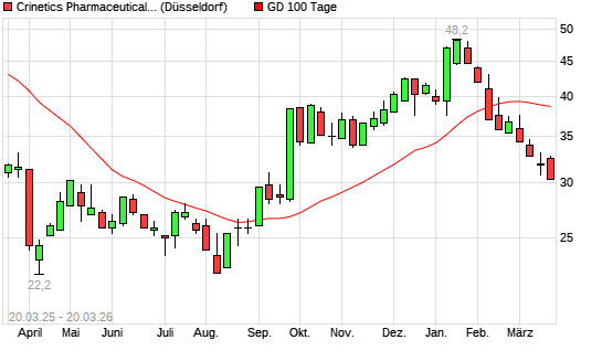 Mit dem Rücksetzer auf 30,60 EUR hat die CRINETICS PHARM.-Aktie am 19.03.2026 die 100-Tage-Linie nach unten gekreuzt.Die CRINETICS PHARM.-Aktie befindet sich seit dem 08.10.2025 ...weiterlesen