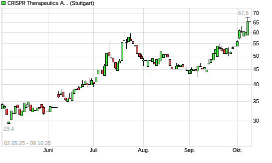 Mit dem Anstieg auf 68,50 EUR hat die CRISPR Therapeutics-Aktie (ISIN CH0334081137) am 08.10.2025 ein neues 12-Monats-Hoch erreicht und damit den Kurs vom 02.10.2025 eingestellt.