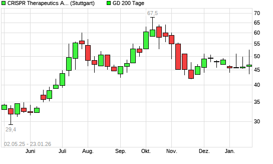 Mit dem Anstieg auf 50,00 EUR hat die CRISPR Therapeutics-Aktie am 22.01.2026 die 200-Tage-Linie nach oben gekreuzt.