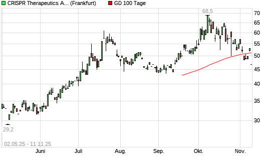 Mit dem Anstieg auf 53,00 EUR hat die CRISPR Therapeutics-Aktie am 10.11.2025 die 100-Tage-Linie nach oben gekreuzt.Die CRISPR Therapeutics-Aktie befindet sich seit dem 24.06.2025 im langfristigen ...weiterlesen