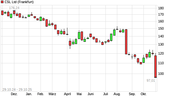 Mit dem Rücksetzer auf 101,00 EUR hat die CSL-Aktie (ISIN AU000000CSL8) am 28.10.2025 ein neues 5-Jahres-Tief erreicht und damit den Kurs vom 26.09.2025 eingestellt.