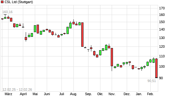Mit dem Rücksetzer auf 94,85 EUR hat die CSL-Aktie (ISIN AU000000CSL8) am 11.02.2026 ein neues 5-Jahres-Tief erreicht und damit den Kurs vom 02.01.2026 eingestellt.