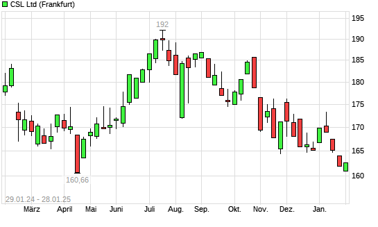 Mit dem Rücksetzer auf 161,00 EUR hat die CSL-Aktie (ISIN AU000000CSL8) am 27.01.2025 ein neues 6-Monats-Tief erreicht und damit den Kurs vom 22.01.2025 eingestellt.