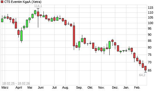 Mit dem Rücksetzer auf 64,60 EUR hat die CTS Eventim-Aktie (ISIN DE0005470306) am 17.02.2026 ein neues 12-Monats-Tief erreicht und damit den Kurs vom 16.02.2026 eingestellt.
