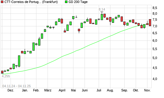 Mit dem Anstieg auf 7,53 EUR hat die CTT-Correios de Portugal-Aktie am 03.11.2025 die 200-Tage-Linie nach oben gekreuzt.
