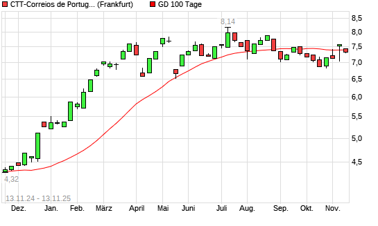 Mit dem Rücksetzer auf 7,30 EUR hat die CTT-Correios de Portugal-Aktie am 12.11.2025 die 100-Tage-Linie nach unten gekreuzt.