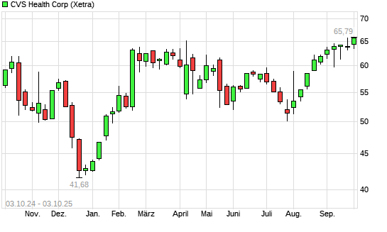 Mit dem Anstieg auf 65,80 EUR hat die CVS Health-Aktie (ISIN US1266501006) am 02.10.2025 ein neues 12-Monats-Hoch erreicht und damit den Kurs vom 24.09.2025 eingestellt.
