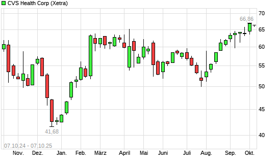 Mit dem Anstieg auf 66,28 EUR hat die CVS Health-Aktie (ISIN US1266501006) am 06.10.2025 ein neues 12-Monats-Hoch erreicht und damit den Kurs vom 03.10.2025 eingestellt.