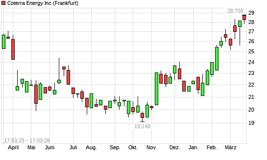 Mit dem Anstieg auf 28,24 EUR hat die Cabot Oil & Gas-Aktie (ISIN US1270971039) am 16.03.2026 ein neues 12-Monats-Hoch erreicht und damit den Kurs vom 13.03.2026 eingestellt.