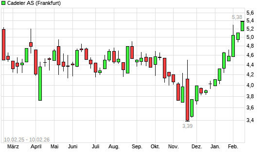 Mit dem Anstieg auf 5,28 EUR hat die Cadeler-Aktie (ISIN DK0061412772) am 09.02.2026 ein neues 12-Monats-Hoch erreicht und damit den Kurs vom 28.01.2026 eingestellt.