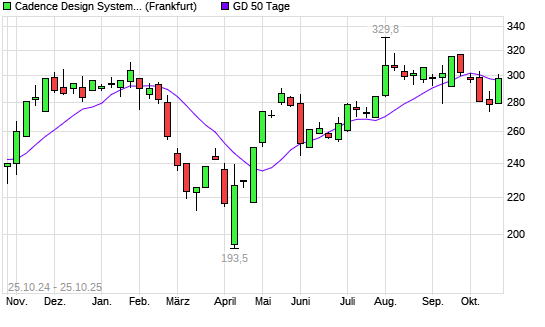 Mit dem Anstieg auf 297,85 EUR hat die Cadence-Aktie am 24.10.2025 die 50-Tage-Linie nach oben gekreuzt.