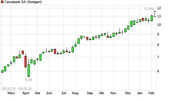 Mit dem Anstieg auf 11,42 EUR hat die Caixabank-Aktie (ISIN ES0140609019) am 04.02.2026 ein neues All-Time-High erreicht und damit den Kurs vom 02.02.2026 eingestellt.
