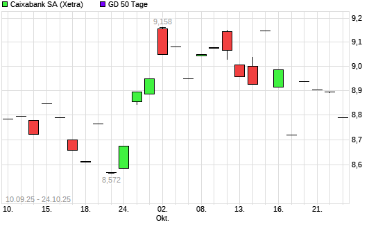 Mit dem Rücksetzer auf 8,76 EUR hat die Caixabank-Aktie am 23.10.2025 die 50-Tage-Linie nach unten gekreuzt.