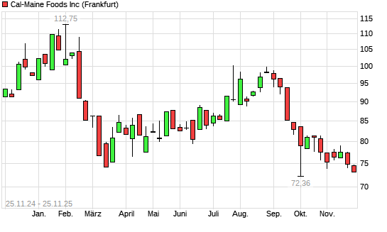 Mit dem Rücksetzer auf 73,70 EUR hat die Cal-Maine Foods-Aktie (ISIN US1280302027) am 24.11.2025 ein neues 12-Monats-Tief erreicht und damit den Kurs vom 14.03.2025 eingestellt.