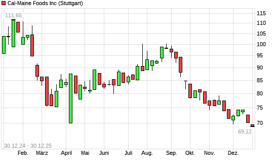 Mit dem Rücksetzer auf 69,56 EUR hat die Cal-Maine Foods-Aktie (ISIN US1280302027) am 29.12.2025 ein neues 12-Monats-Tief erreicht und damit den Kurs vom 02.12.2025 eingestellt.