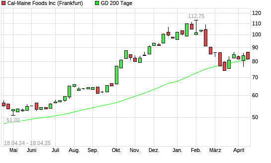 Mit dem Rücksetzer auf 81,52 EUR hat die Cal-Maine Foods-Aktie am 17.04.2025 die 200-Tage-Linie nach unten gekreuzt.