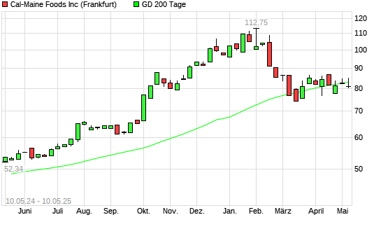 Mit dem Rücksetzer auf 80,70 EUR hat die Cal-Maine Foods-Aktie am 09.05.2025 die 200-Tage-Linie nach unten gekreuzt.